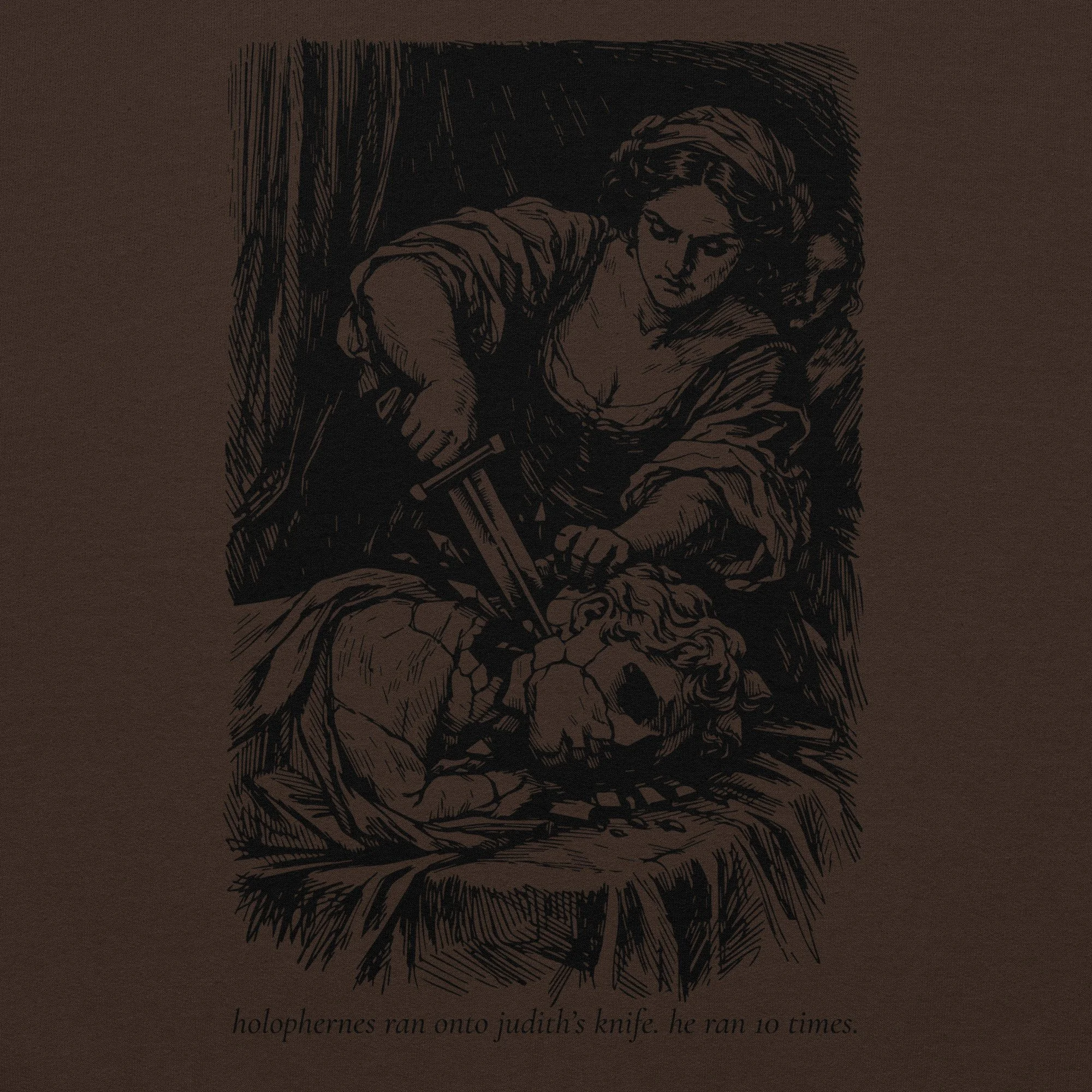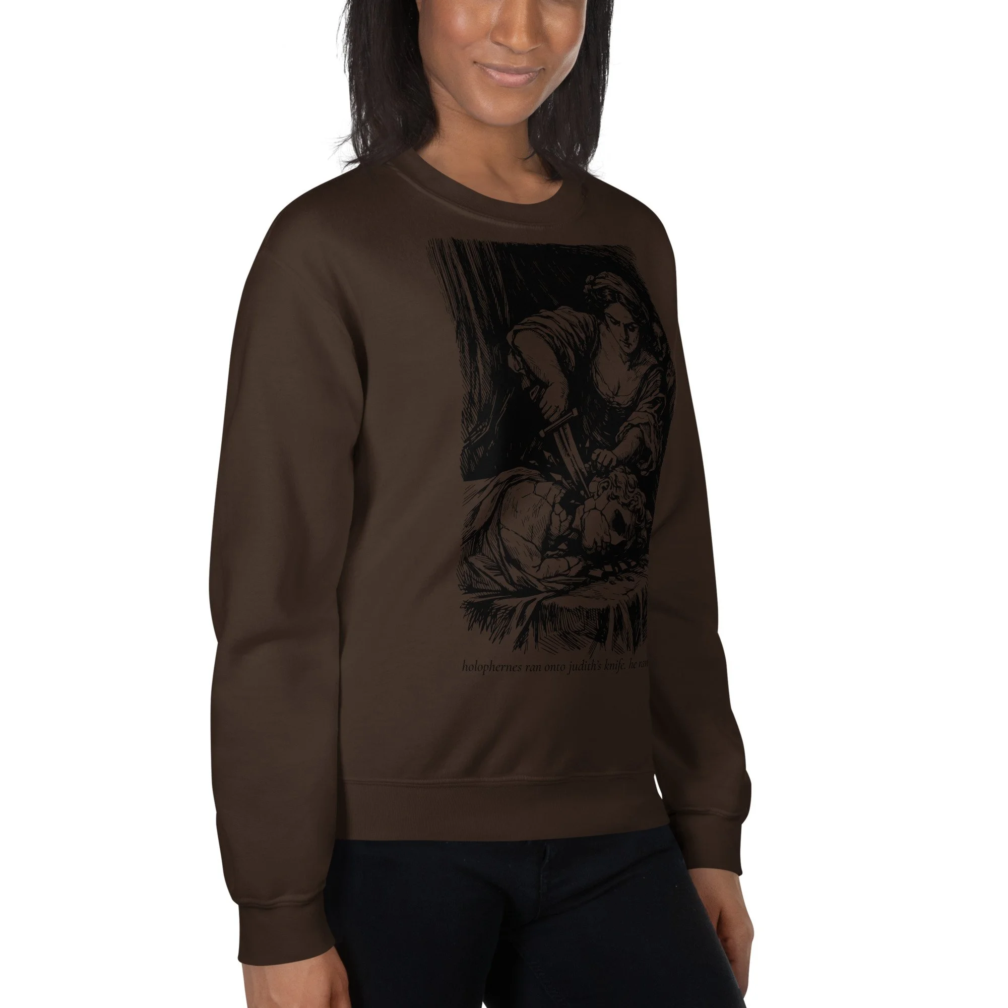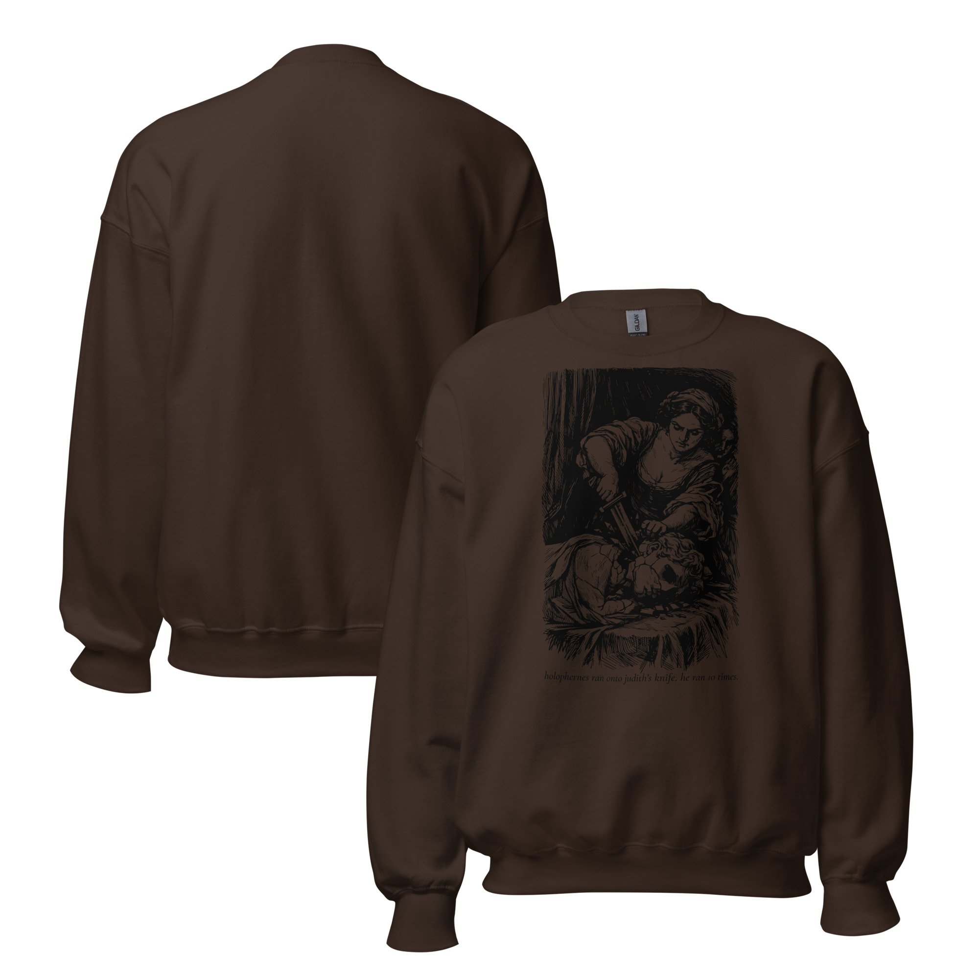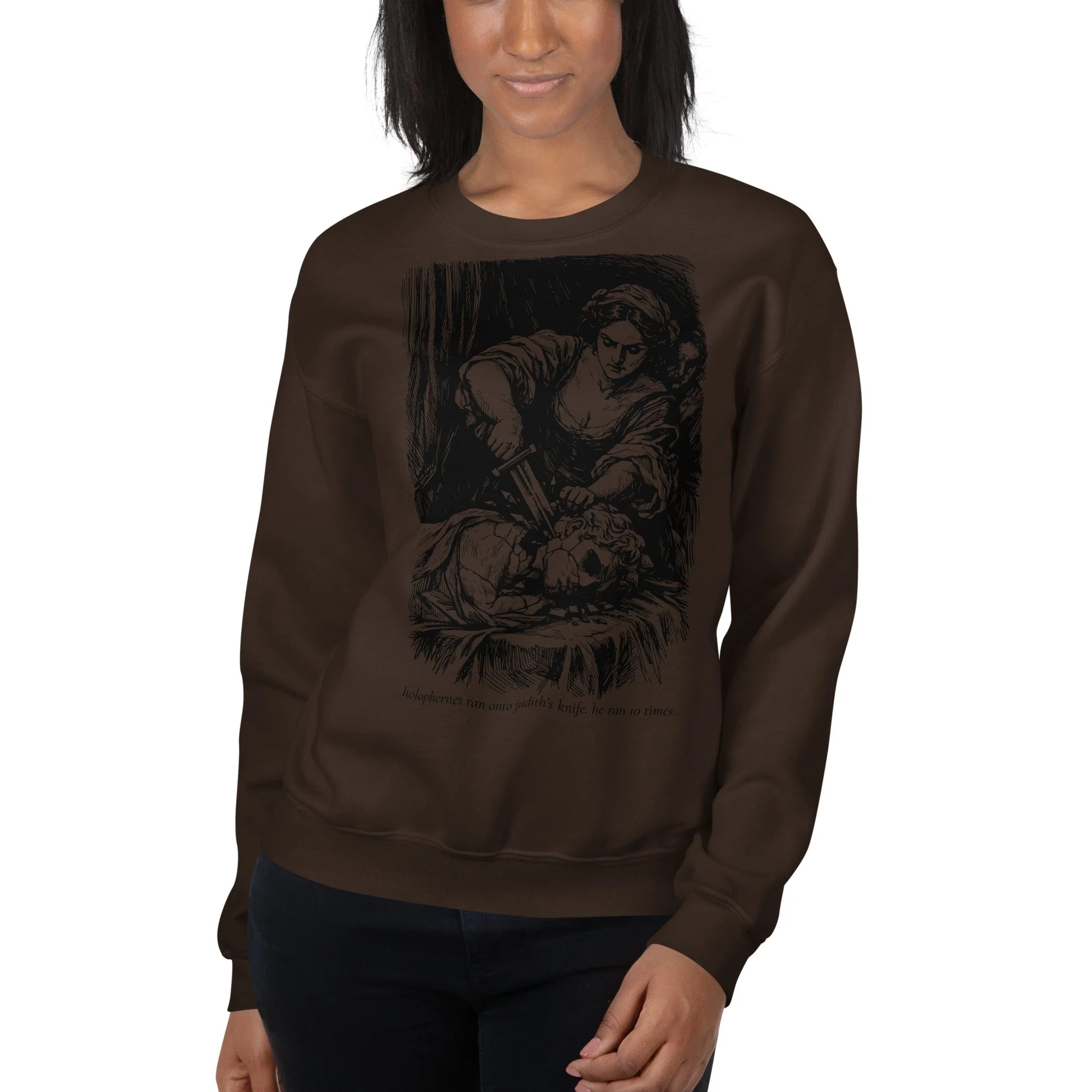 Meet your new favorite sweatshirt: a warm brown classic crewneck featuring Judith doing the iconic “oops, Holofernes got in my way” move, immortalized in custom cross-hatch line art. Underneath, the sassiest quote you’ll read all week: