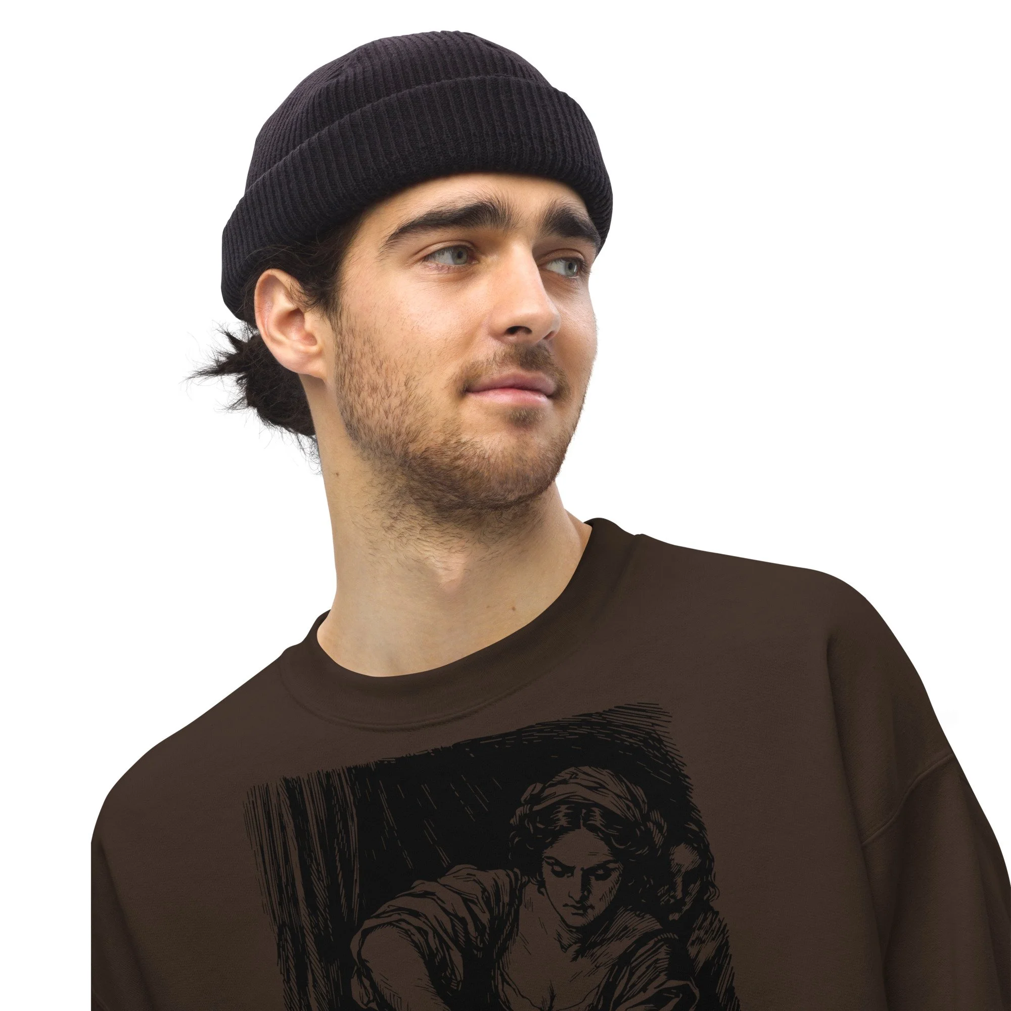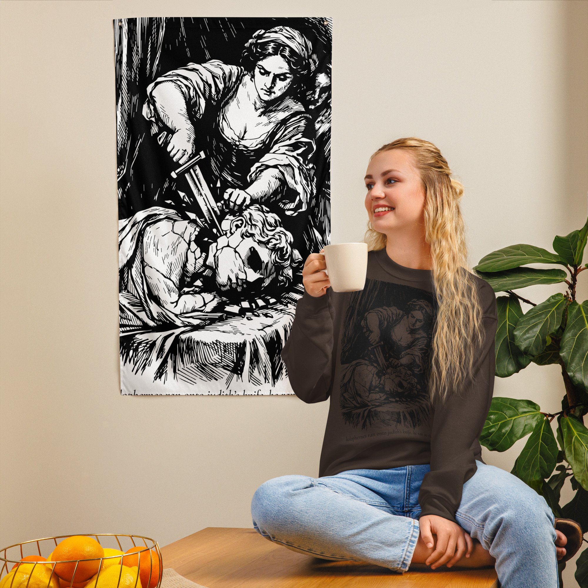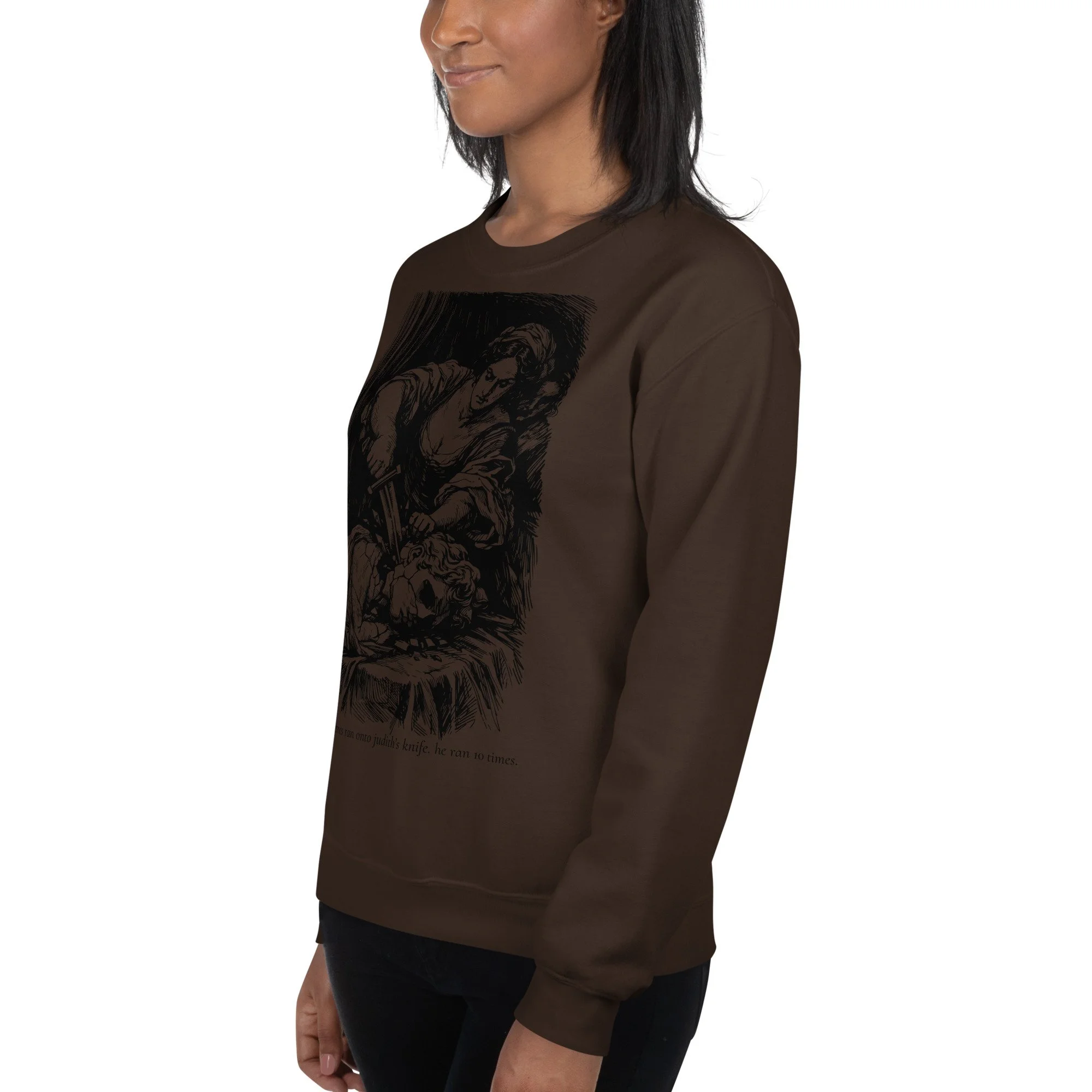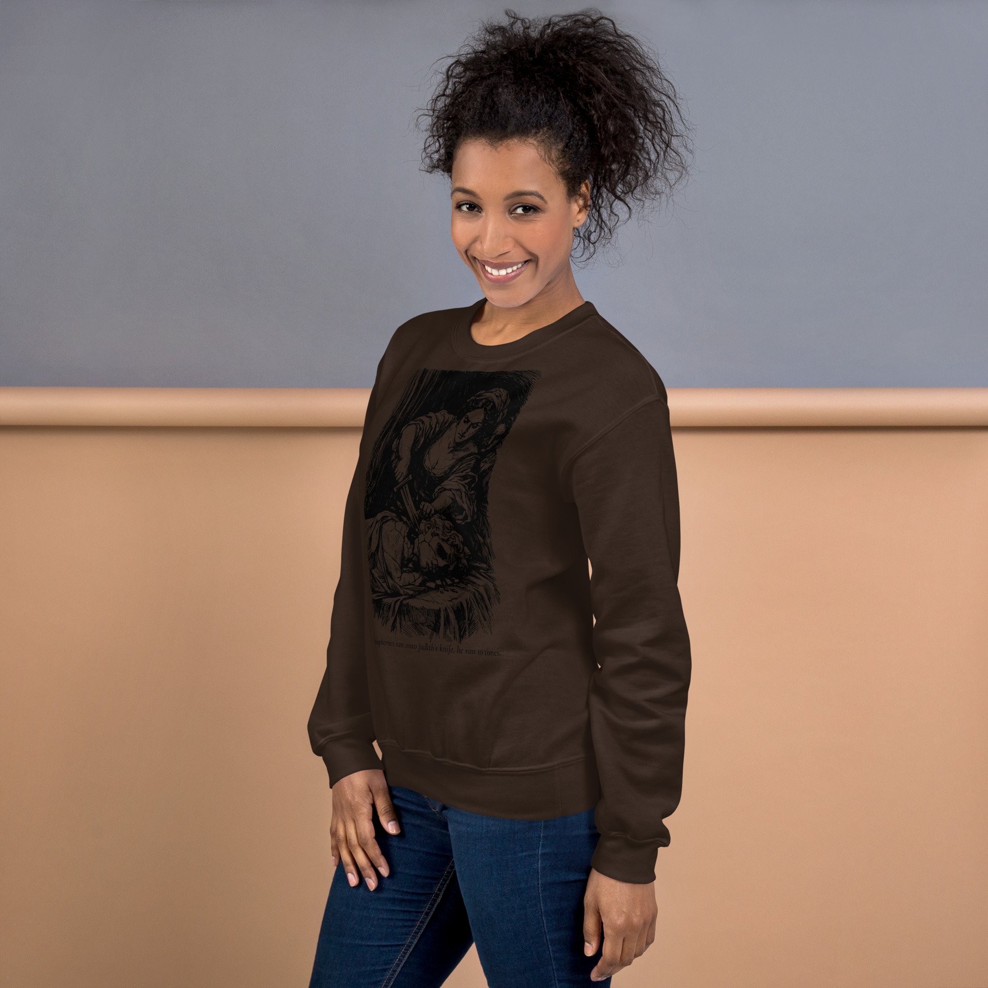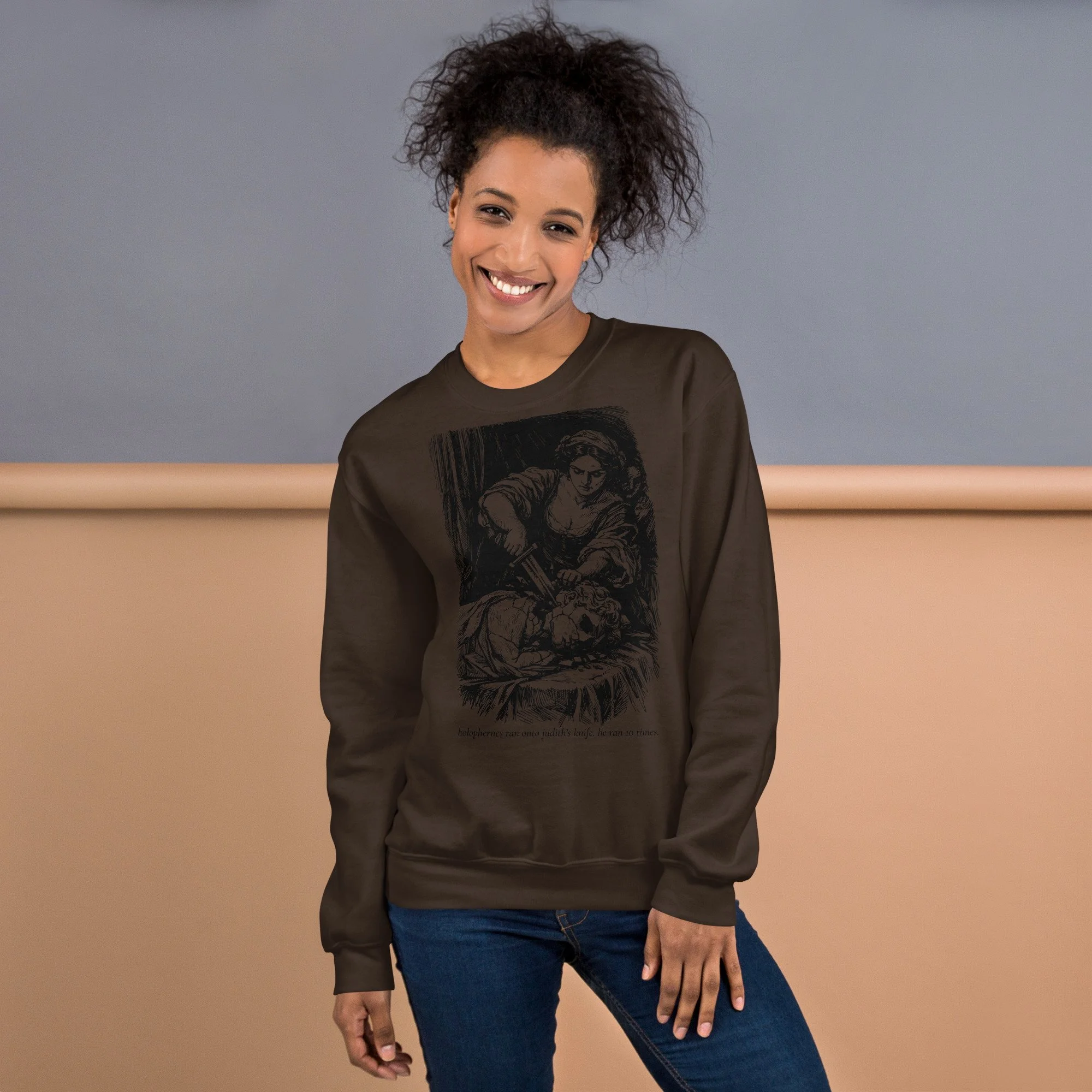 Meet your new favorite sweatshirt: a warm brown classic crewneck featuring Judith doing the iconic “oops, Holofernes got in my way” move, immortalized in custom cross-hatch line art. Underneath, the sassiest quote you’ll read all week: