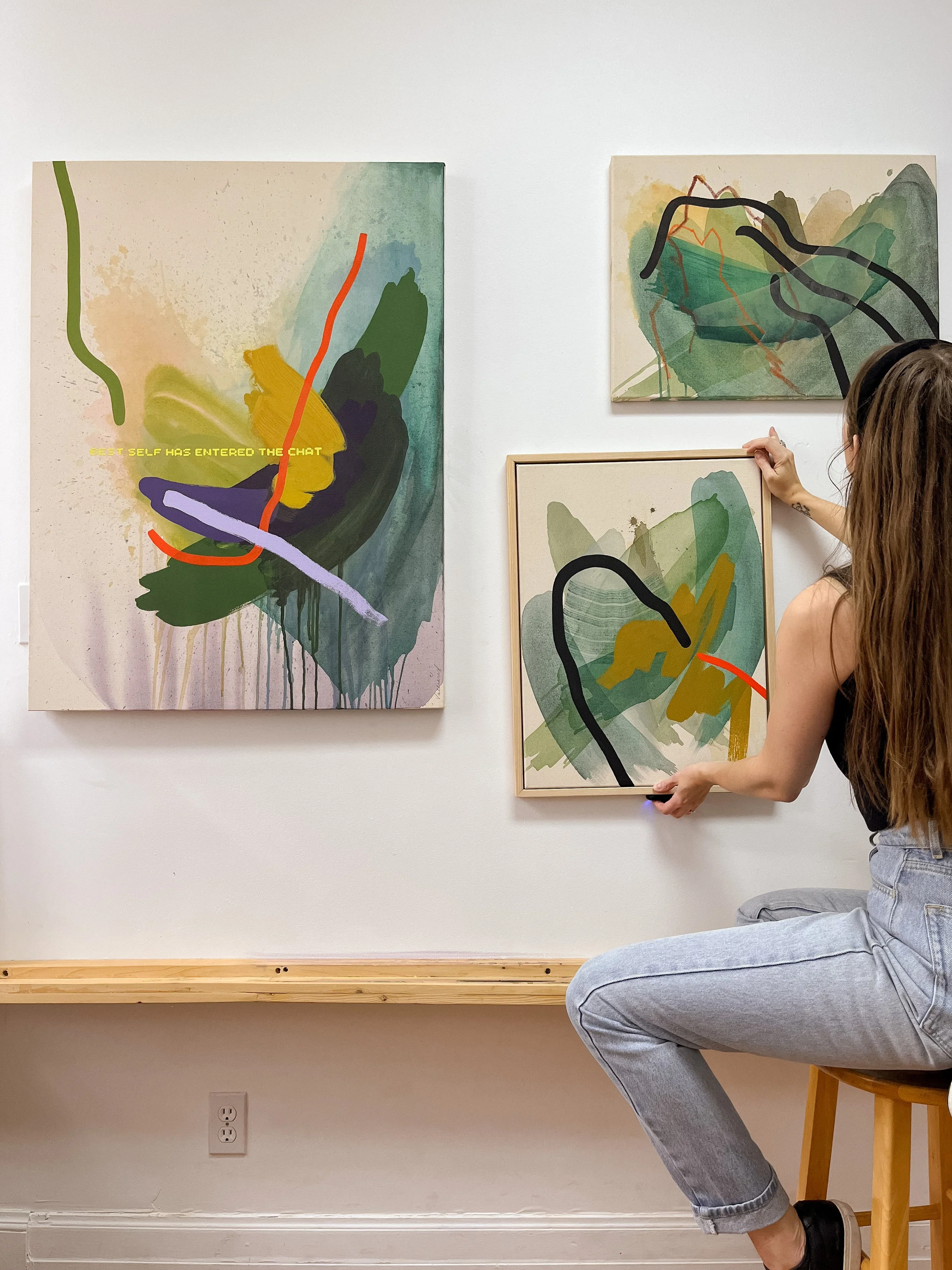 Chaque toile est peinte à l’acrylique avec ma technique intuitive et expressive.